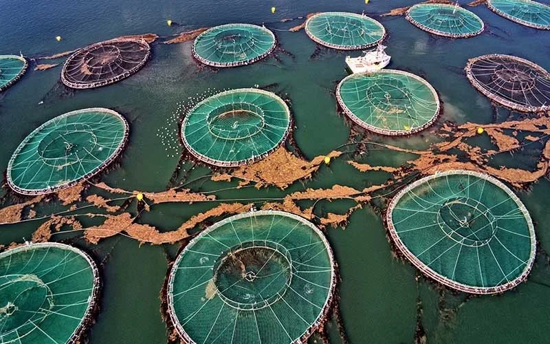 Farmed salmon are raised in crowded open-net pens where waste, parasites, and diseases can spread quickly. Sea lice infestations are one of the biggest problems — these parasites thrive in the pens and often spread to wild salmon passing by, threatening their survival. Farmed fish are also treated with chemicals and antibiotics to manage these conditions, and escapes from pens can disrupt wild salmon genetics and ecosystems.